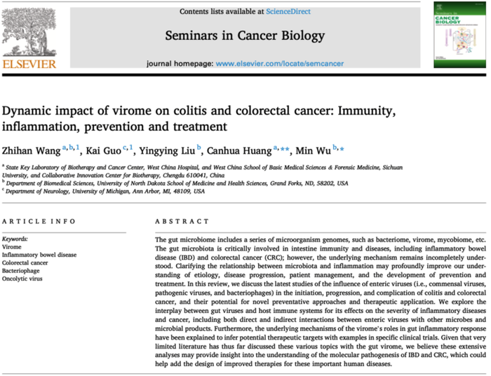 2021.10.14 Zhihan Wang Research Assistant Review Published in Seminars in Cancer Biology.On October 14, 2021, Assistant Researcher Wang Zhihan published a review article entitled "Dynamic impact of virome on colitis and colorectal cancer: Immunity, inflammation, prevention and treatment" in the journal Seminars in Cancer Biology, a well-known international oncology journal. Enteroviruses are closely related to intestinal immunity and diseases (e.g. inflammatory bowel disease and colorectal cancer), but the mechanisms underlying the association between the two are still not fully understood. In this review, we summarize and discuss recent studies on the impact of enteroviruses (symbiotic viruses, pathogenic viruses, and bacteriophages) on the occurrence, progression, and complications of colitis and colorectal cancer, the interactions between enteroviruses and other microorganisms, and the underlying mechanisms of action. Clinical trials of phage therapy and oncolytic virus therapy, related bioinformatics tools, major challenges facing the field, and future research directions are explored. Due to the limited research on the role of enteroviruses in intestinal inflammation and tumors, this review contributes to a better understanding of the etiology, disease progression, and treatment.