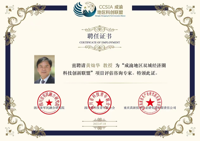 2022.07.18 Professor Huang Canhua is a project evaluation consultant for the "Science and Technology Innovation Alliance of Shuangcheng Economic Circle in Chengdu and Chongqing"In July 2022, our supervisor, Professor Huang Canhua, was appointed as a project evaluation consultant for the "Chengdu-Chongqing Shuangcheng Economic Circle Science and Technology Innovation Alliance".
