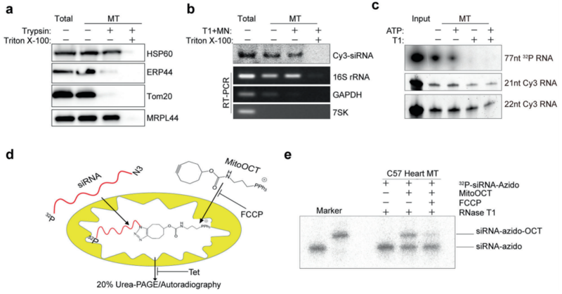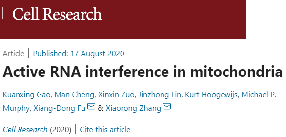 包括小干扰RNA(siRNA),微小RNA(miRNA)和piRNA在内的小RNA在调节真核细胞中的基因表达中起关键作用。RNA干扰(RNAi)途径已在大多数真核细胞中得到很好的阐明。甚至更低的真核生物(例如各种酵母)也具有活性RNAi,尽管某些酵母物种(例如出芽酵母,已经丧失了这种能力,可以通过在RNAi途径中重新表达特定的酶来恢复这种能力)。RNAi已被利用来研究各种生物学背景下的基因功能。然而,有趣的是,到目前为止,还不清楚RNAi样机制是否可以在线粒体中起作用,而线粒体被认为是由寄生细菌引起的。难题在于,已知某些细菌具有Argonaute的同源物,即Argonaute。RNA诱导沉默复合物(RISC)中的关键酶负责在高等真核细胞中靶向RNA降解,先前研究发现特定的miRNA不仅在线粒体可检测到,而且在线粒体中也有功能。miRNA和siRNA的加工和功能基本上使用相同的机制,问题是RNAi样机制是否也可以在线粒体中起作用,不是很清楚。线粒体是真核细胞中的内共生细胞器,可作为通过氧化磷酸化(OXPHOS)产生ATP的强大动力。有趣的是,线粒体基因组在进化过程中变化最小。例如,人类线粒体基因组的长度仅约16kb,编码2个必需的rRNA和最少的22个tRNA进行翻译,以及13个多肽,所有这些都是膜蛋白,是呼吸链复合体的一部分。基本上,线粒体中的所有生化活动都需要核基因组(nDNA)编码的蛋白质。尽管许多nDNA编码的蛋白质携带进入线粒体的特定信号序列,但其中至少30%缺乏此类信号,以及某些RNA是否可以进入线粒体是一个开放的,值得商榷的问题。许多低等真核生物显然需要导入tRNA来进行线粒体翻译,因为有些mtDNA甚至不编码任何tRNA。