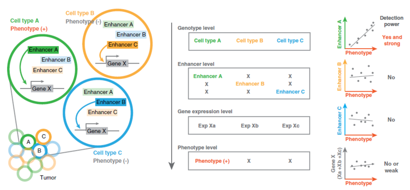 如果说上述问题仅仅是对于内涵和外延已然明确的转录调控概念进行丰富和完善,那么从上个世纪八十年代开始的对于增强子(enhancer)的研究至今仍很大程度地着眼于其定义本身,即增强子是什么、在哪里、具备怎样的功能和基因组特征【8】。增强子研究的系统性困难根植于其本身模糊的定义空间和多样灵活的行为模式:“不受作用距离和序列取向限制与基因启动子相互作用促进转录”的定义使得增强子成为了几乎可能遍布于整个基因组的“暗物质”。 对增强子的位置进行搜索的一个重大突破来自于本世纪第一个十年间由Phillip Sharp课题组和任兵(Bing Ren)课题组等发展起来的对于组蛋白修饰H3K27ac和H3K4me1和增强子活性的显著关联【9,10】。由ENCODE计划领衔的对组织特异性表观遗传特征基于染色质免疫沉降技术进行系统性描绘的努力,则使得具有特殊修饰状态的组蛋白与DNA区域的结合几乎成为了判断增强子存在性的金指标。随着研究界对反式调控因子尤其是主调控转录因子(master transcription regulator)捕获的快速进展,增强子的蛋白结合标记得到了极大的扩展。2013年,Richard Young实验室首次提出了“超级增强子”(super enhancer)概念【11】,将其发展为一个由丰富转录因子结合和普遍转录激活为特征的基因调控枢纽。